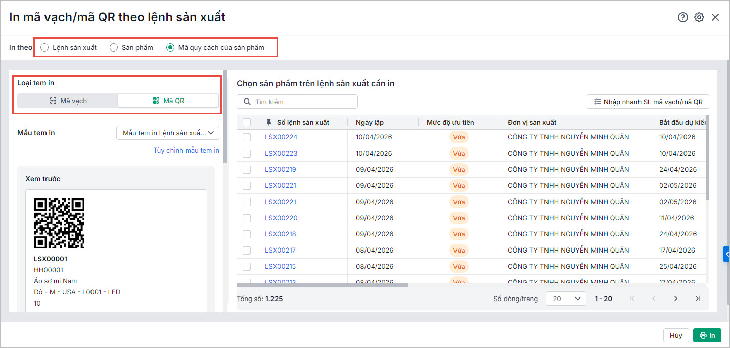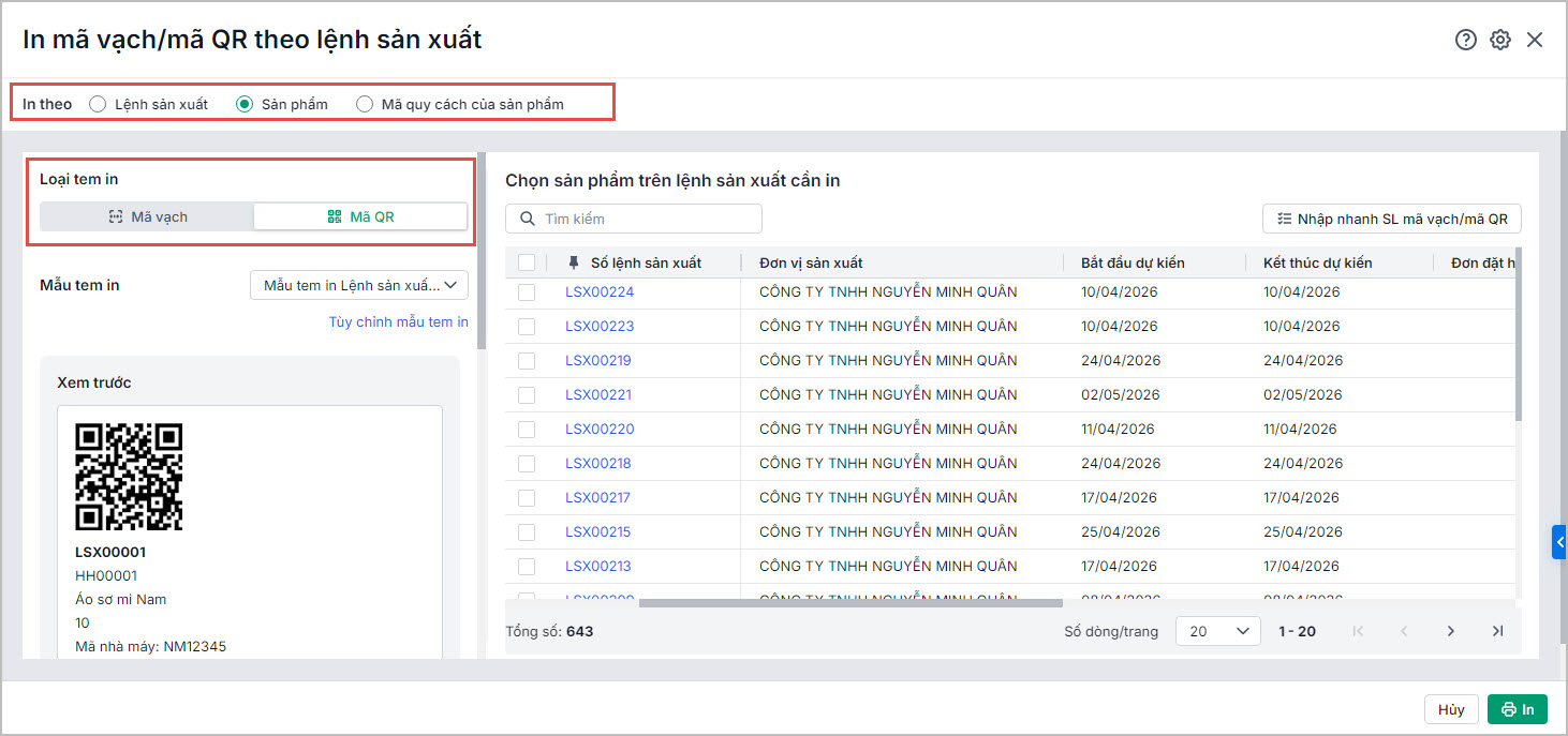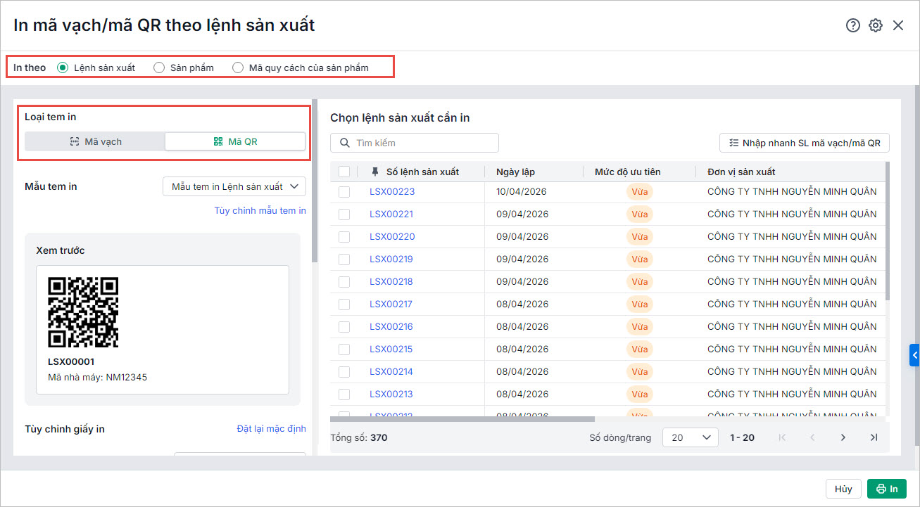 Bước 2: In mã vạch/mã QR theo lệnh sản xuất