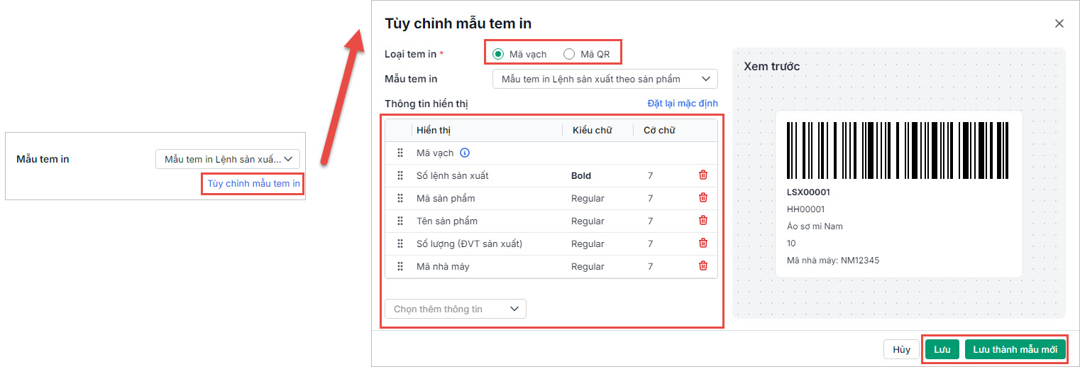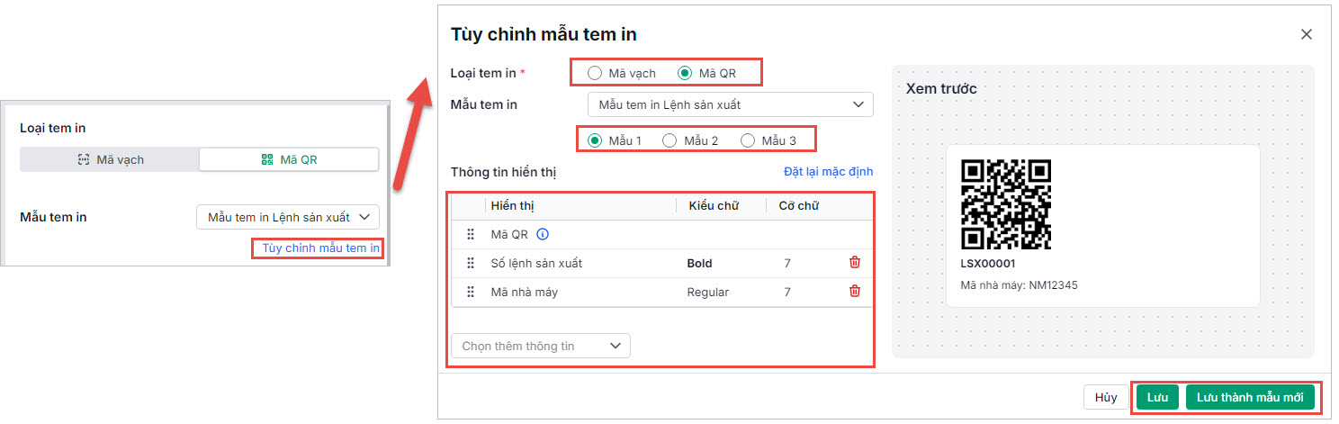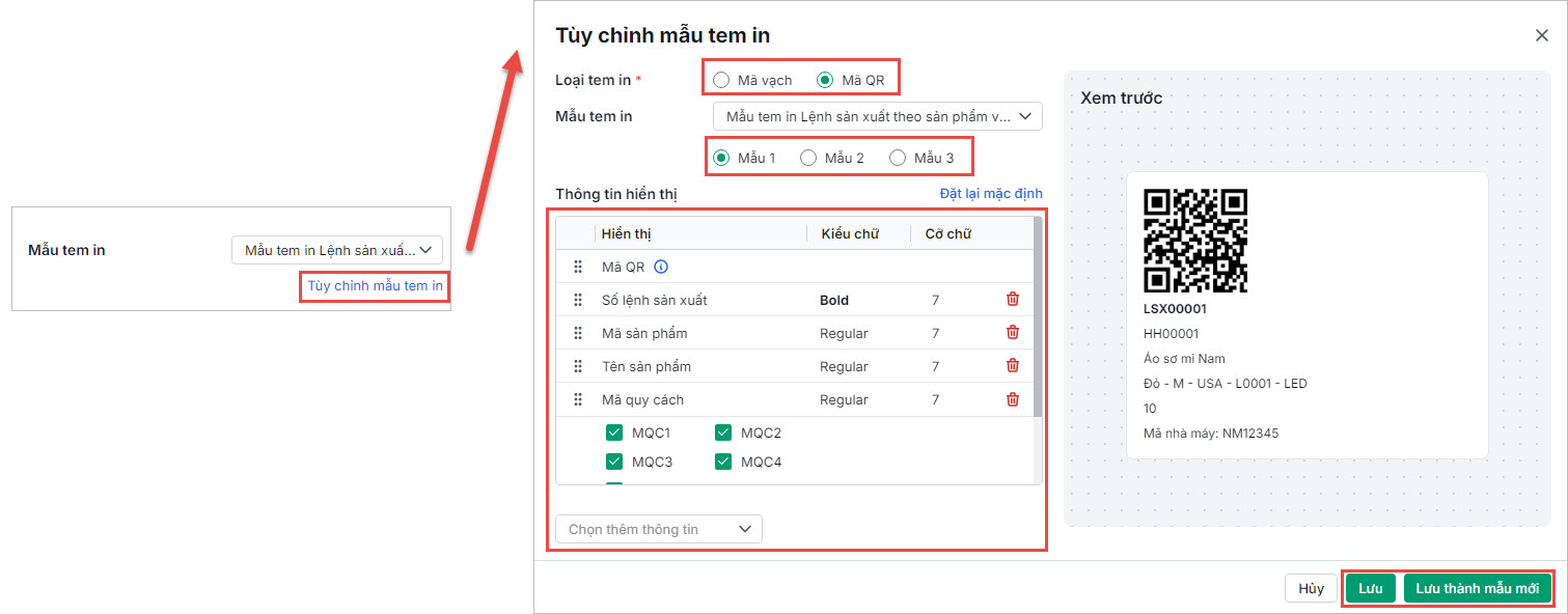 • Trên giao diện In mã vạch/mã QR theo lệnh sản xuất, thiết lập mẫu tem in: