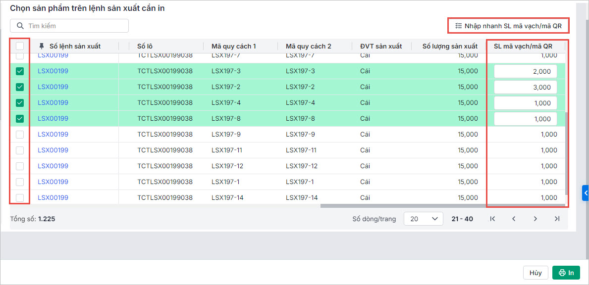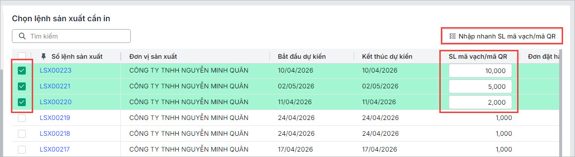 • Anh/chị tích chọn các lệnh sản xuất cần in mã vạch, thay đổi số lượng mã vạch cần in (nếu cần)
