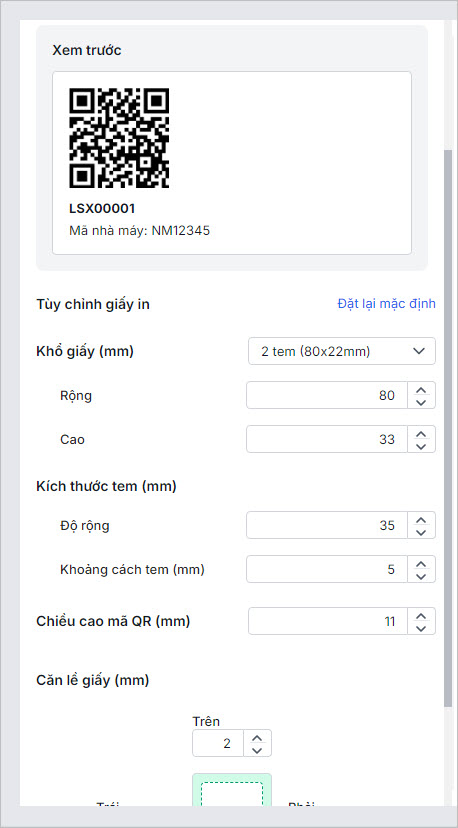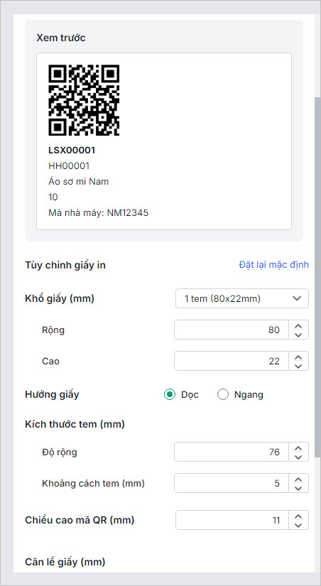 • Tùy chỉnh giấy in: Tùy chỉnh lại các thông tin Khổ giấy, Hướng giấy, Kích thước tem, Chiều cao mã vạch/mã QR, Căn lề khổ giấy,… (nếu cần)