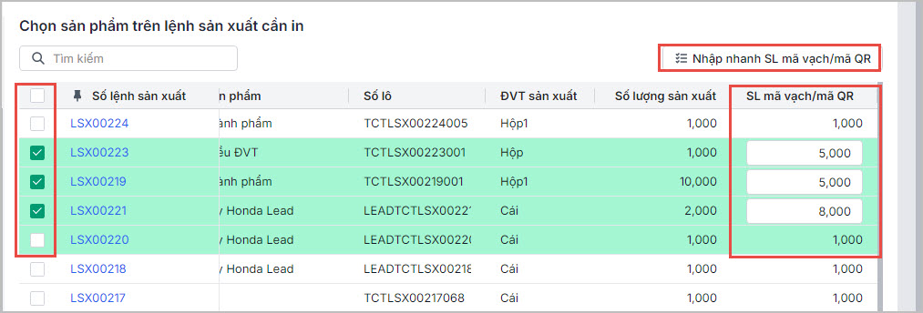 Lưu ý: Anh/chị có thể nhập hàng loạt mã vạch/mã QR theo số lượng tùy chọn bằng cách chọn chức năng nhập nhanh SL mã vạch/mã QR.