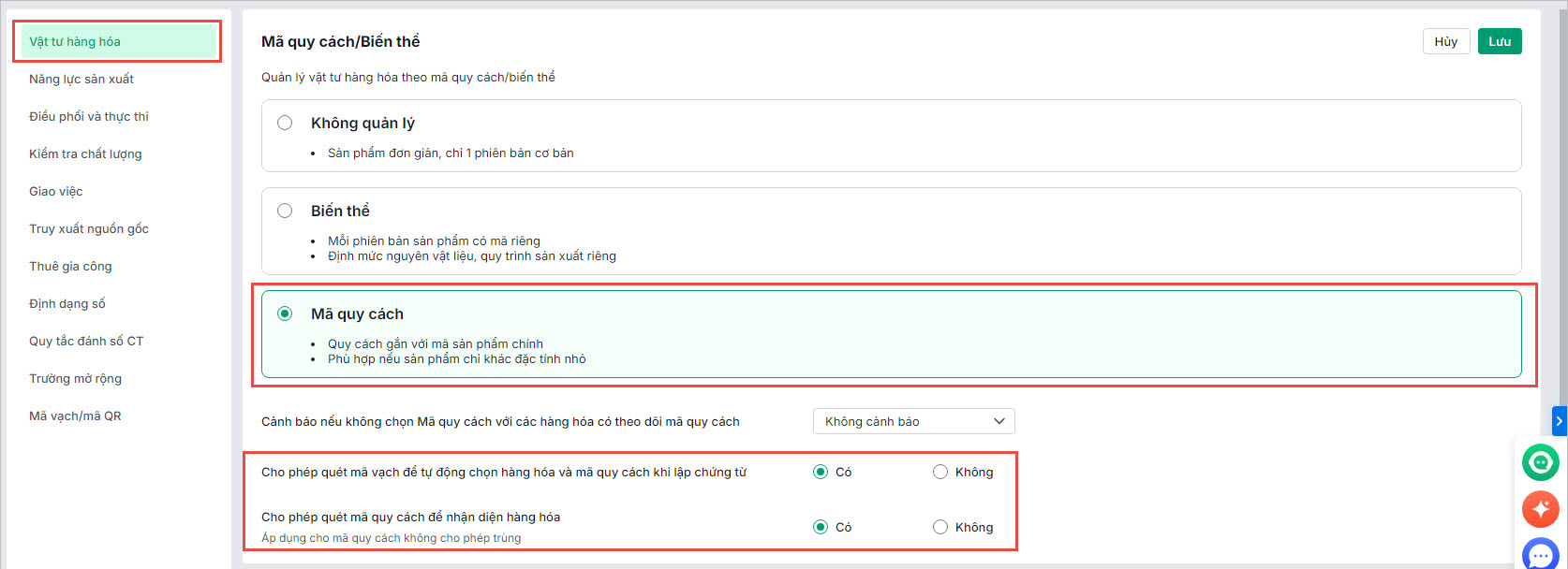• Cho phép quét mã quy cách để nhận diện hàng hóa (Áp dụng cho sản phẩm quản lý theo mã quy cách loại không cho phép trùng)