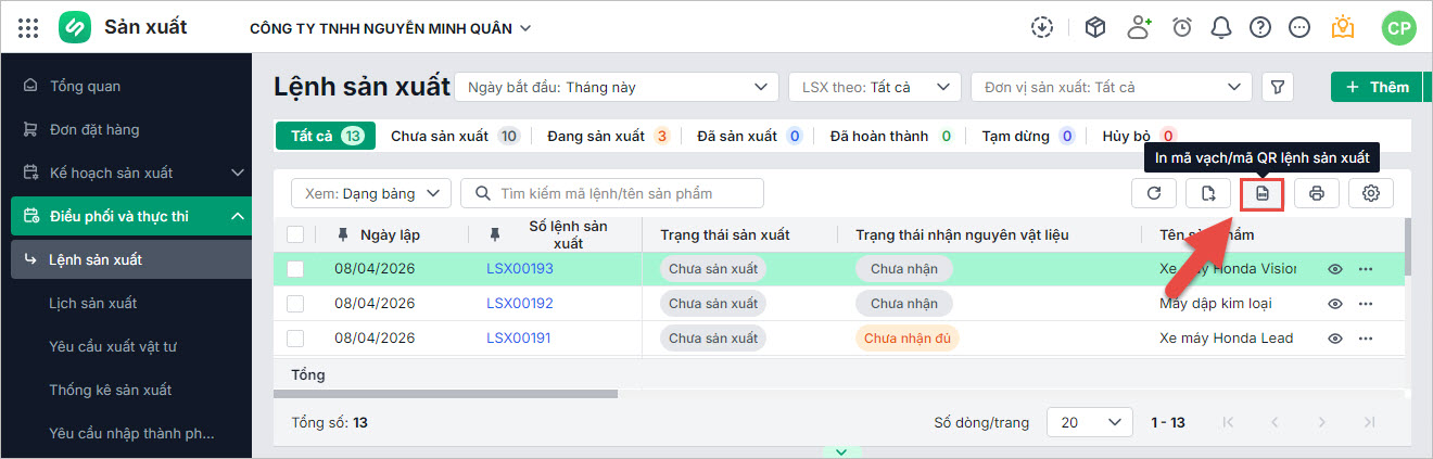 Trên danh sách Lệnh sản xuất, anh chị chọn biểu tượng chức năng In mã vạch/mã QR lệnh sản xuất.