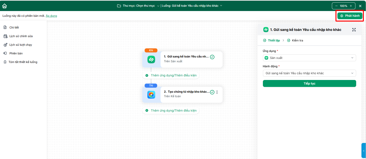 - Thiết lập và phát hành các luồng đồng bộ yêu cầu nhập thành phẩm, NVL thừa trên AMIS Workflow