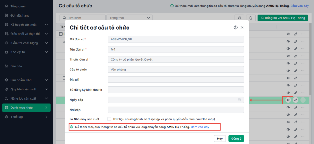 2. Trường hợp cần thêm mới/sửa thông tin Cơ cấu tổ chức, nhấn dòng text Bấm vào tại đây tại danh mục hoặc tại giao diện chi tiết cơ cấu tổ chức bên trên, chương trình sẽ điều chuyển sang giao diện AMIS Hệ thống => thực hiện thêm mới/sửa Cơ cấu tổ chức trên AMIS Hệ thống.