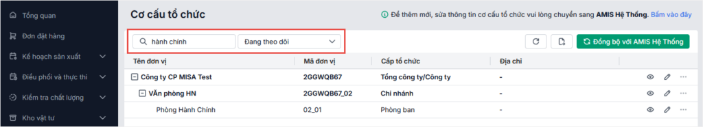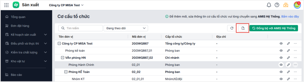 1. Danh mục cơ cấu tổ chức trên MISA AMIS sẽ được đồng bộ từ danh mục cơ cấu tổ chức trên AMIS Hệ thống. Có thể nhấn nút Đồng bộ với AMIS Hệ thống để cập nhật dữ liệu mới nhất.