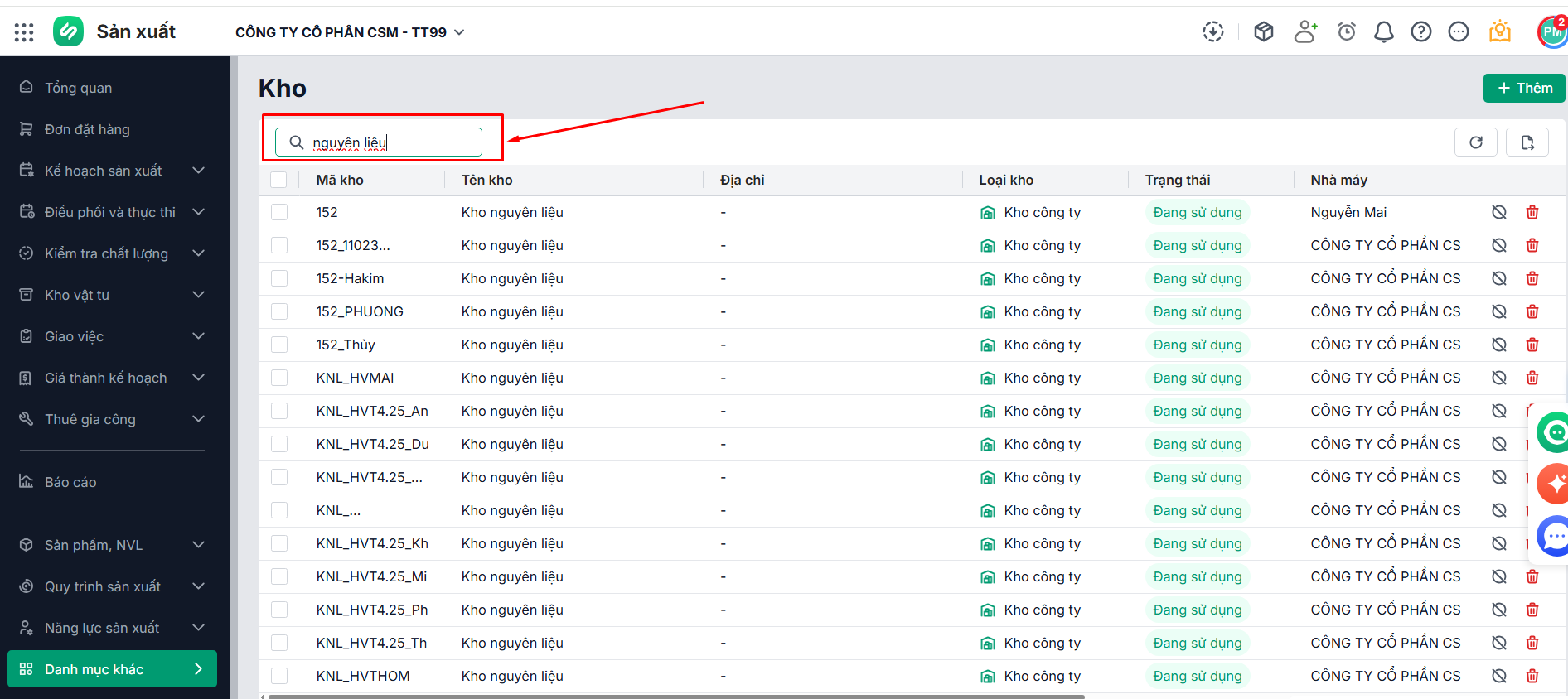 - Tìm kiếm kho bằng cách gõ tên kho/địa chỉ kho/mã kho tại thanh tìm kiếm.