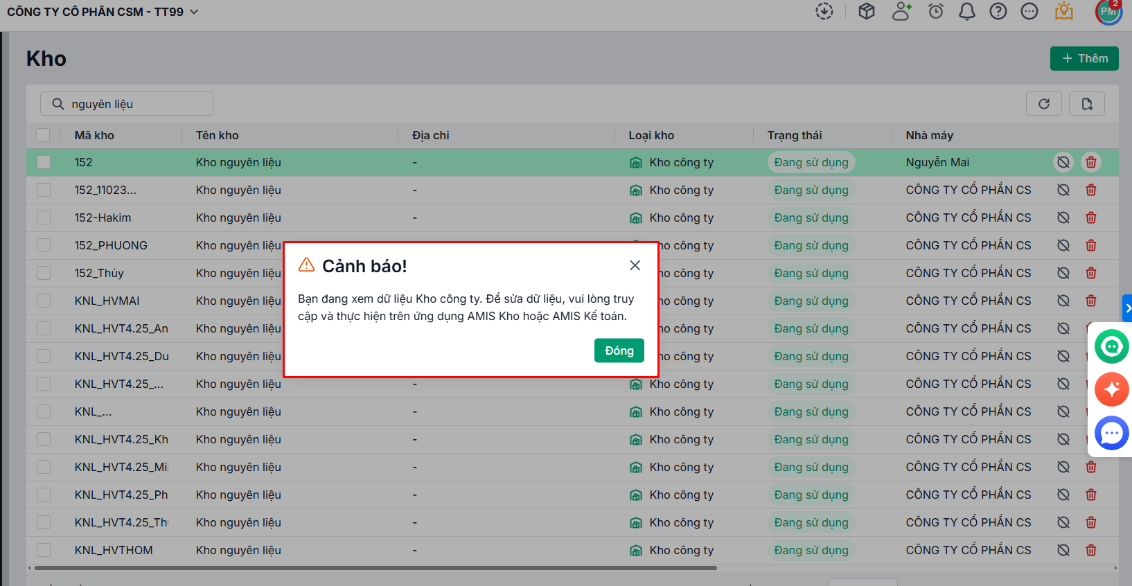 Lưu ý: Không thể sửa Kho vì danh mục kho chỉ có thể thực hiện sửa AMIS Kho hoặc AMIS Kế toán.