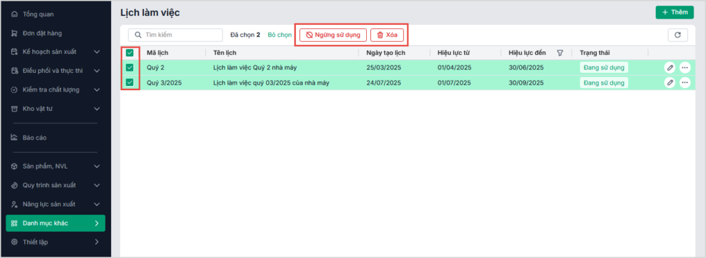 4. Có thể tích chọn ngừng sử dụng hoặc xóa cùng lúc hàng loạt lịch làm việc bằng cách tích chọn hàng loạt lịch làm việc, nhấn Ngừng sử dụng hoặc Xóa.