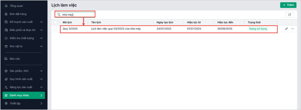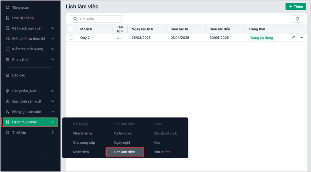 1. Vào Danh mục khác, chọn Lịch làm việc, nhấn Thêm.