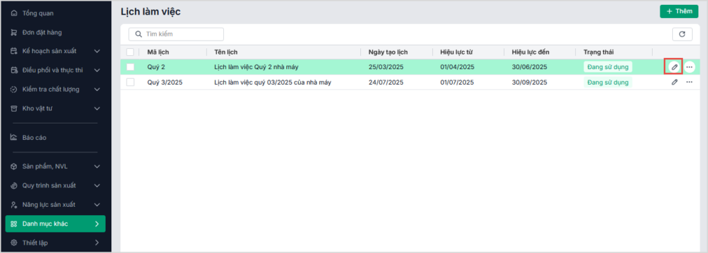 2. Sửa lại thông tin lịch làm việc nếu cần bằng cách nhấn biểu tượng sửa.