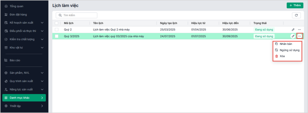 3. Có thể thực hiện các tiện ích như: Nhân bản, đánh dấu ngừng sử dụng, xóa lịch làm việc bằng cách nhấn biểu tượng 3 chấm tại dòng thông tin, sau đó chọn tiện ích cần sử dụng.