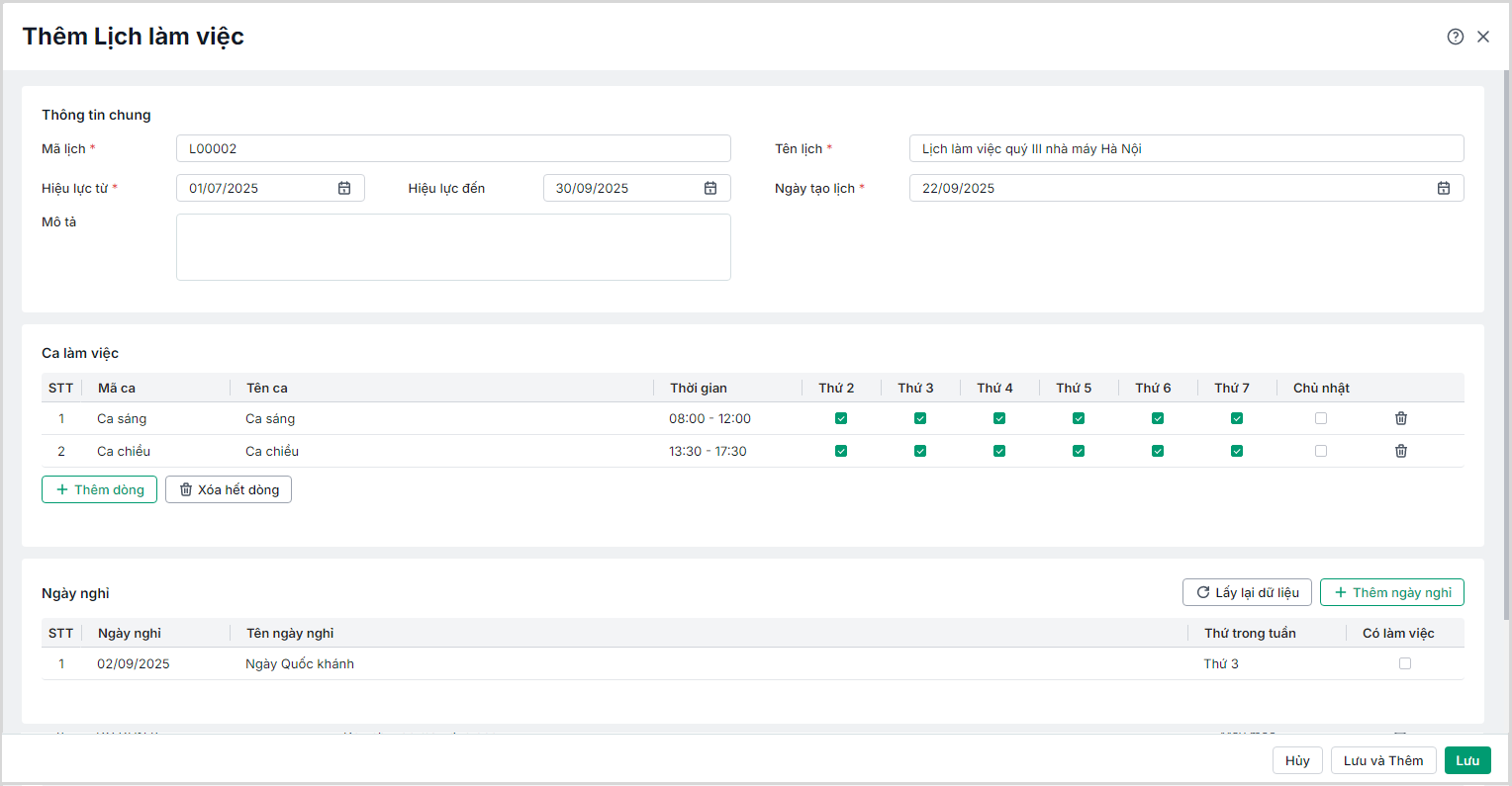 • Nhấn Thêm ngày nghỉ để bổ sung các ngày không làm việc, ngày lễ nếu cần thiết.
