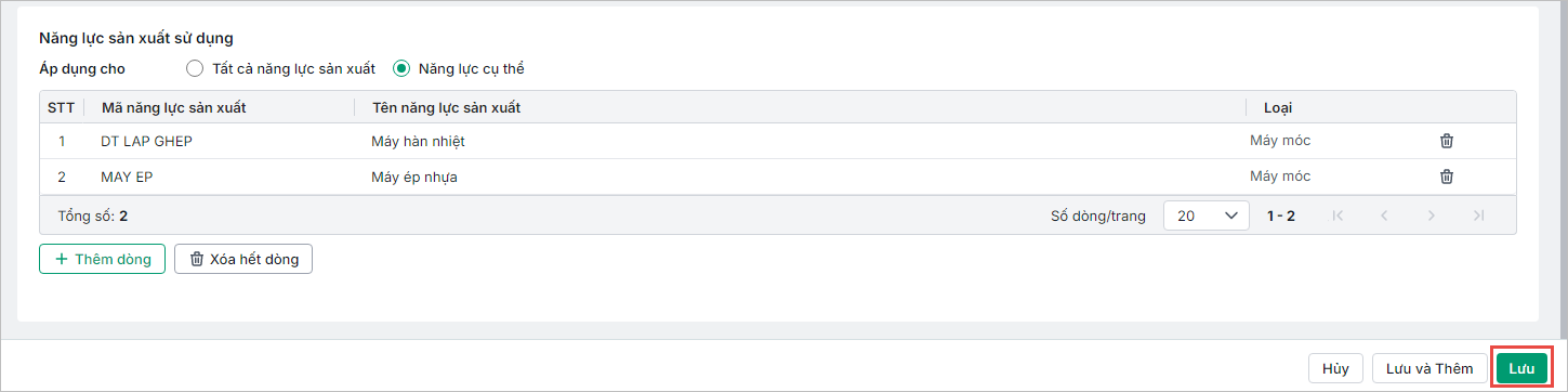 • Tích chọn Áp dụng cho Tất cả năng lực sản xuất: Lịch làm việc áp dụng cho tất cả các năng lực sản xuất.