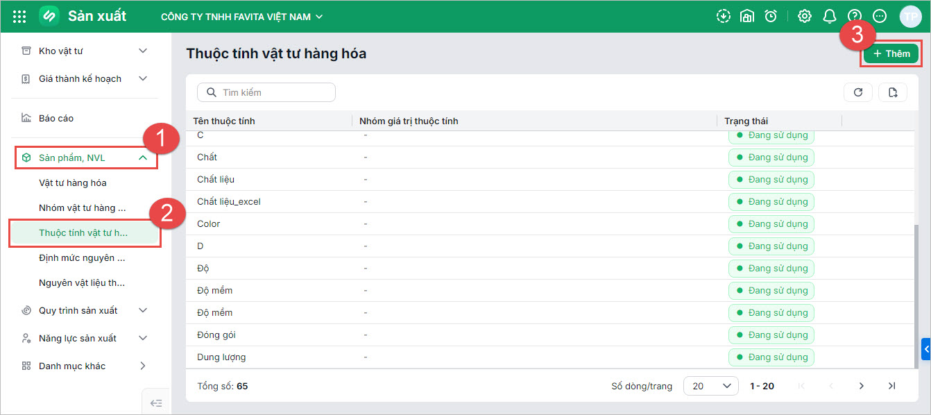 1. Vào menu Sản phẩm, NVL, chọn mục Thuộc tính vật tư hàng hóa, nhấn Thêm