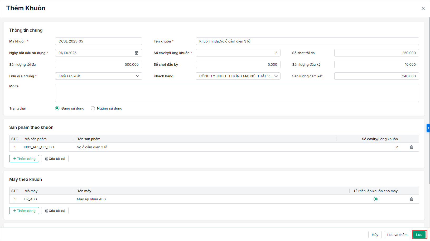 - Ngày bắt đầu sử dụng, Số lòng khuôn, sản lượng/Số shot tối đa, sản lượng/Số shot đầu kỳ của khuôn