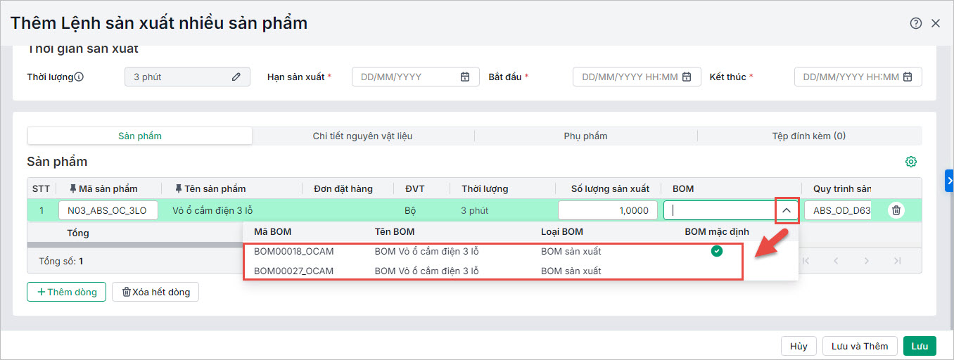 Sau khi hoàn tất, anh/chị nhấn Lưu để thêm hoặc Lưu và Thêm để thêm nhanh lệnh sản xuất khác.