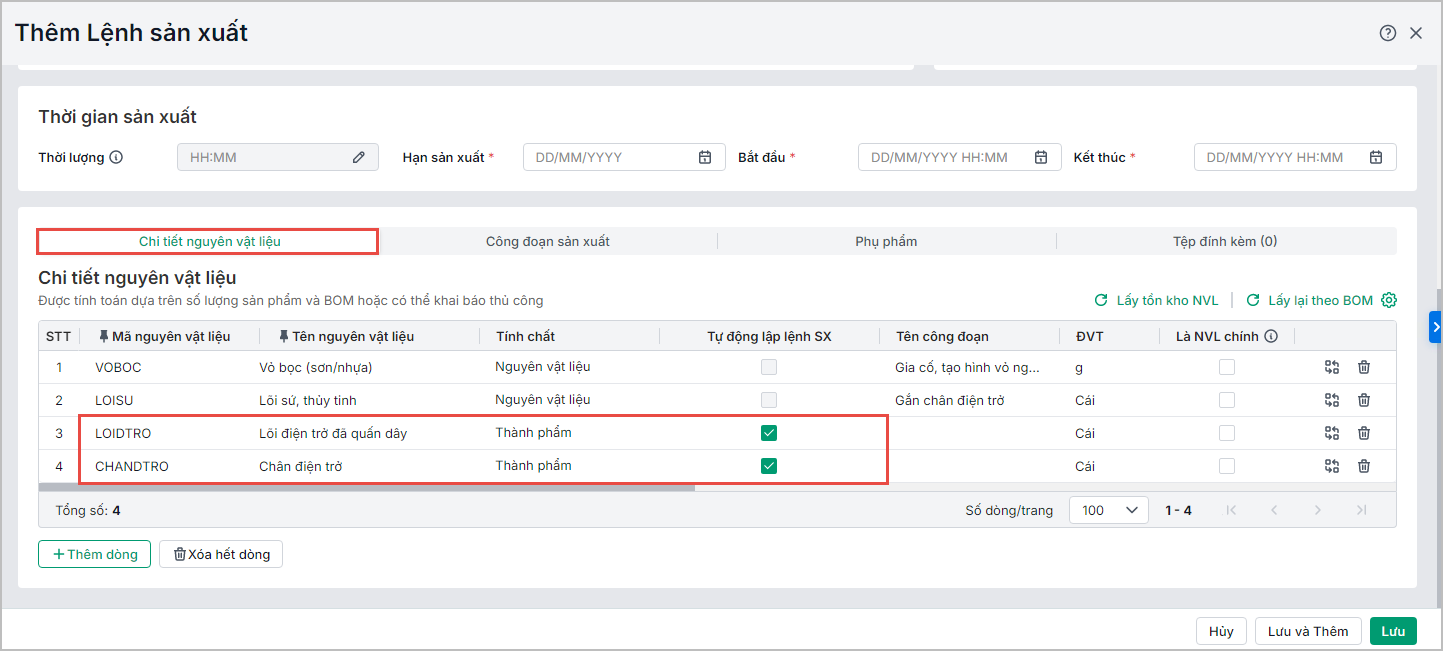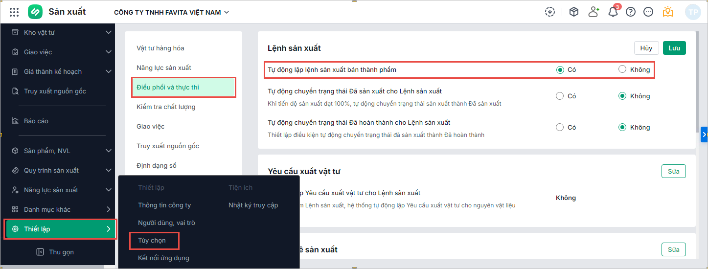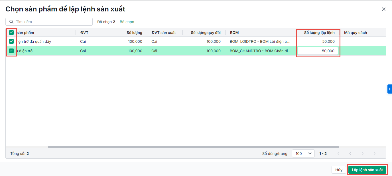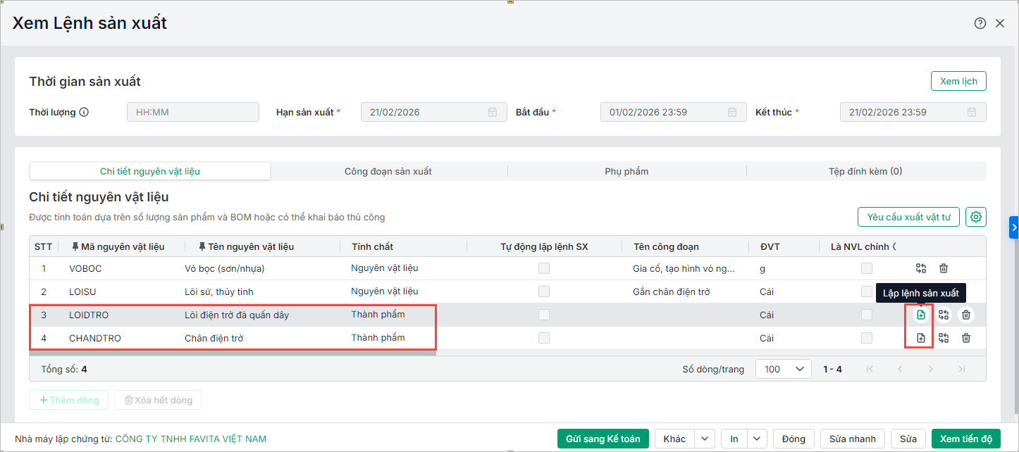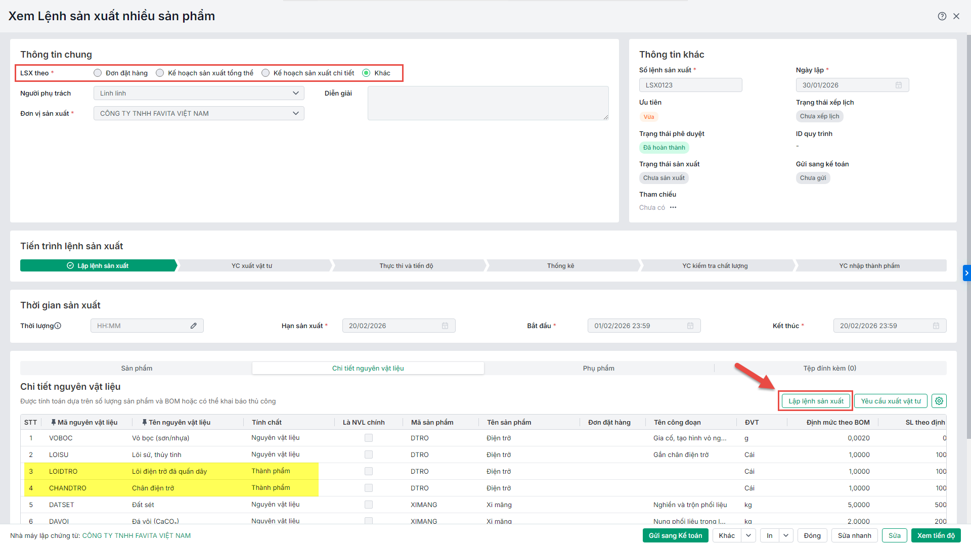 - Chương trình chỉ cho phép thực hiện được chức năng này đối với lệnh sản xuất có Trạng thái phê duyệt = Đã hoàn thành (Nếu có thiết lập luồng phê duyệt lệnh sản xuất trên AMIS Workflow)