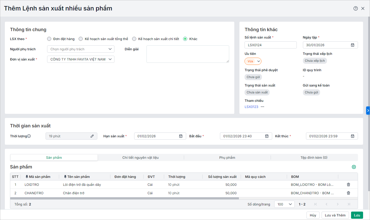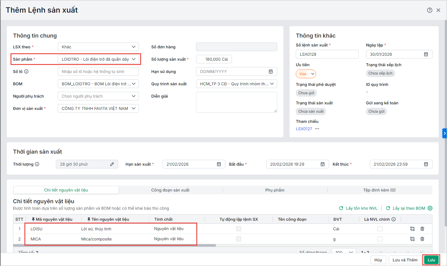 - Chương trình chỉ hỗ trợ lập lệnh sản xuất cho NVL có tính chất là Thành phẩm đối với loại LSX lập theo Đơn đặt hàng hoặc loại LSX Khác.