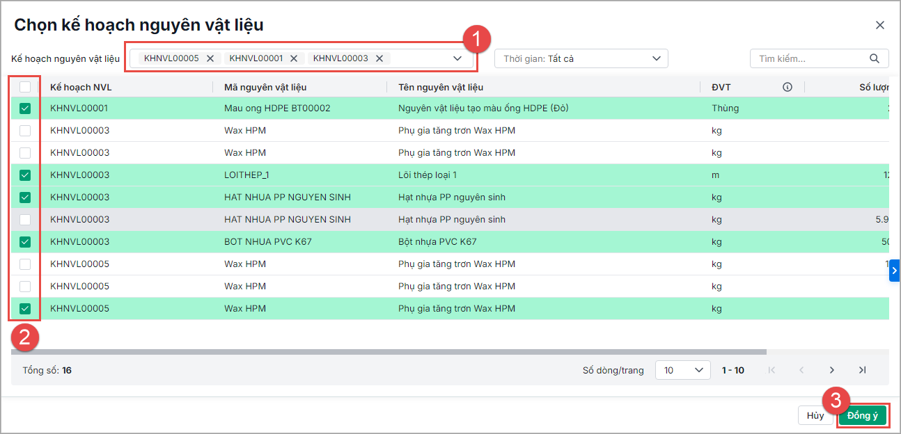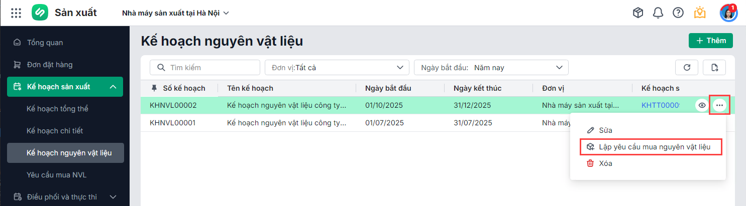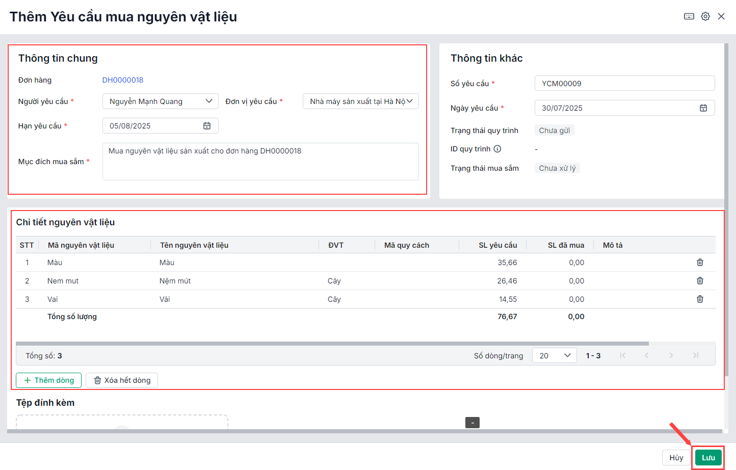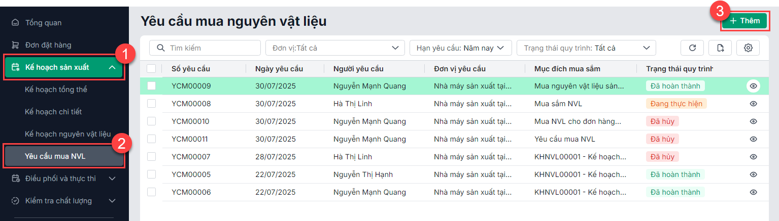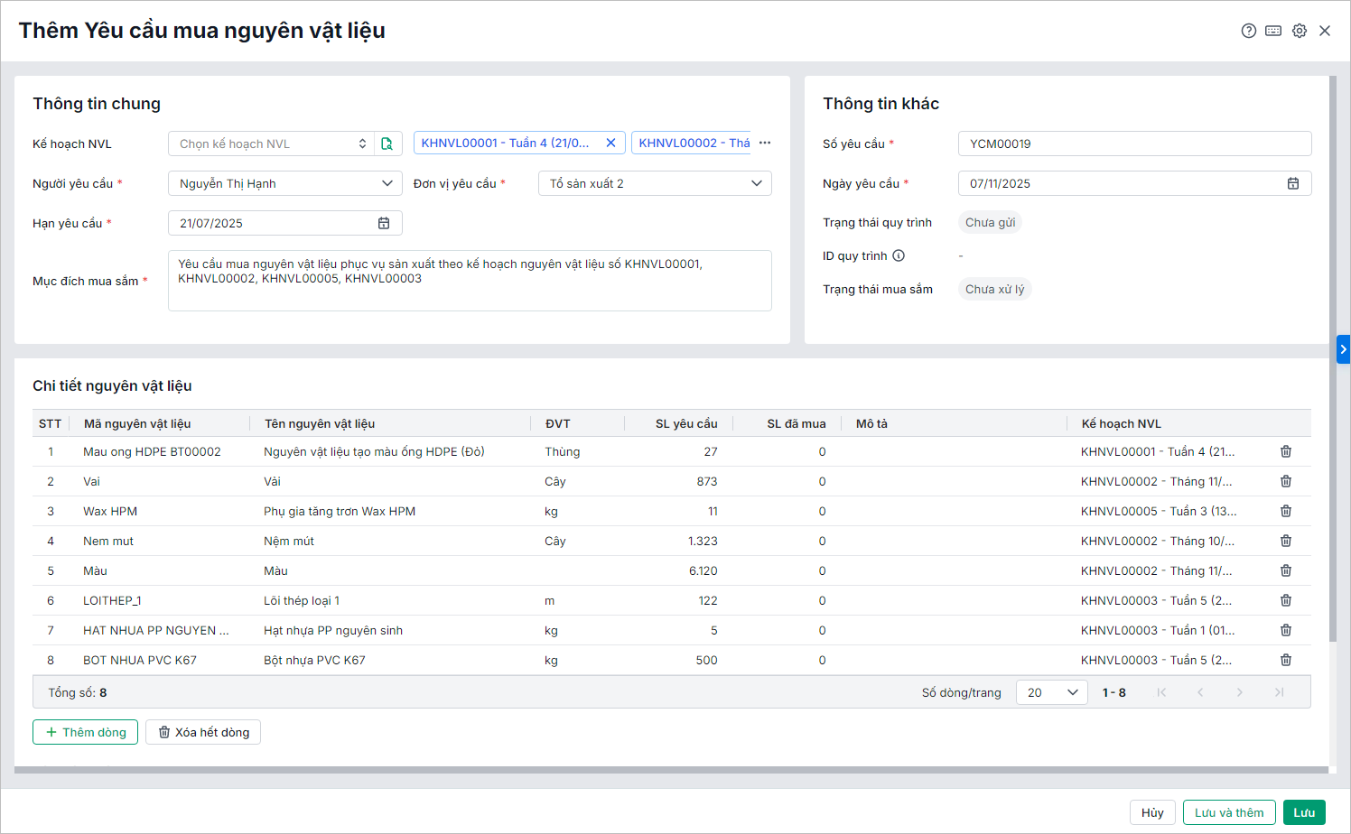 2.1. Thêm Yêu cầu mua sắm nguyên vật liệu