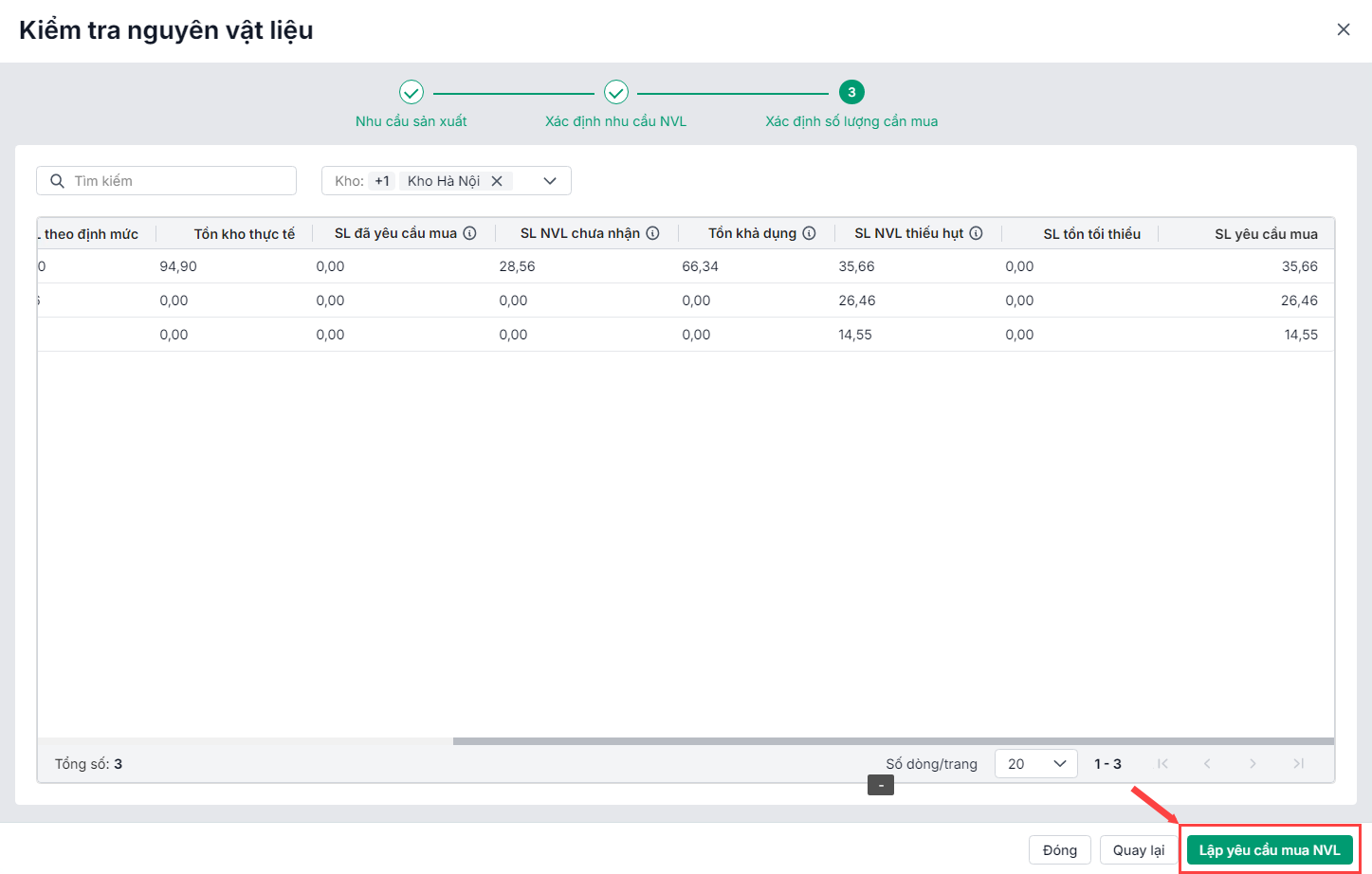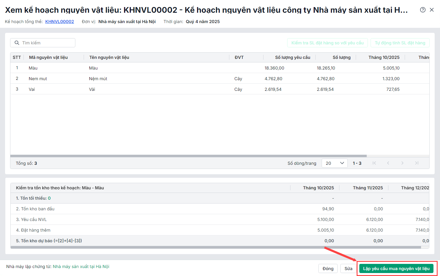 Lưu ý: Chỉ những người dùng có quyền lập Yêu cầu mua nguyên vật liệu mới thực hiện được thao tác này.