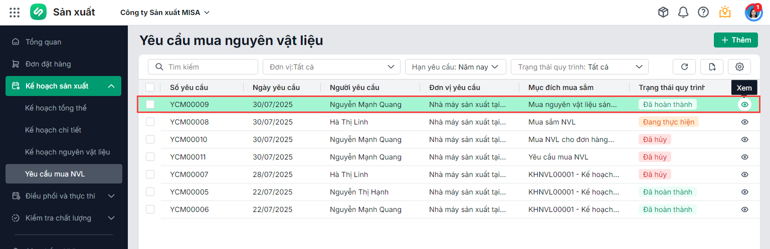 - Sau khi lượt chạy hoàn tất phê duyệt, AMIS Quy trình tự động tạo và đẩy dữ liệu Yêu cầu mua sắm để nhân viên mua hàng thực hiện mua sắm NVL được yêu cầu.