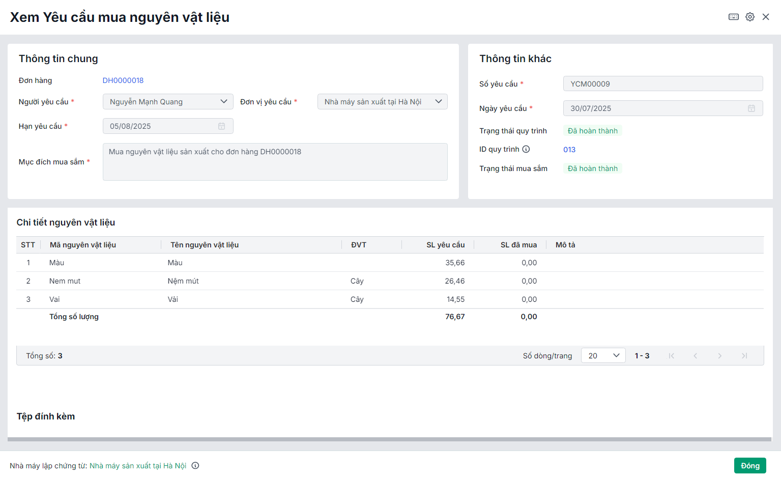 Trên chi tiết Yêu cầu mua sắm NVL anh/chị có thể theo dõi: