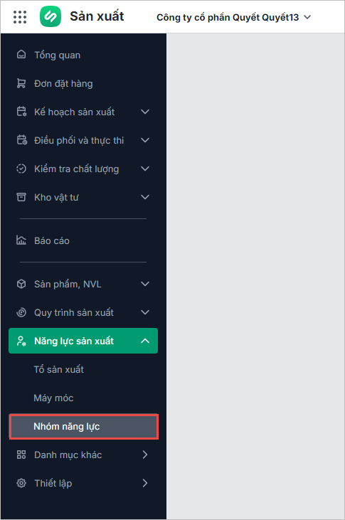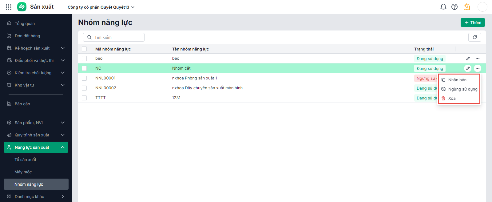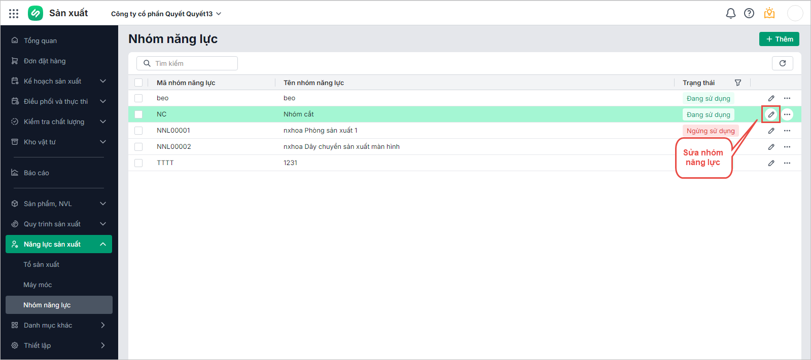 - Tại mục Năng lực sản xuất, chọn Nhóm năng lực: