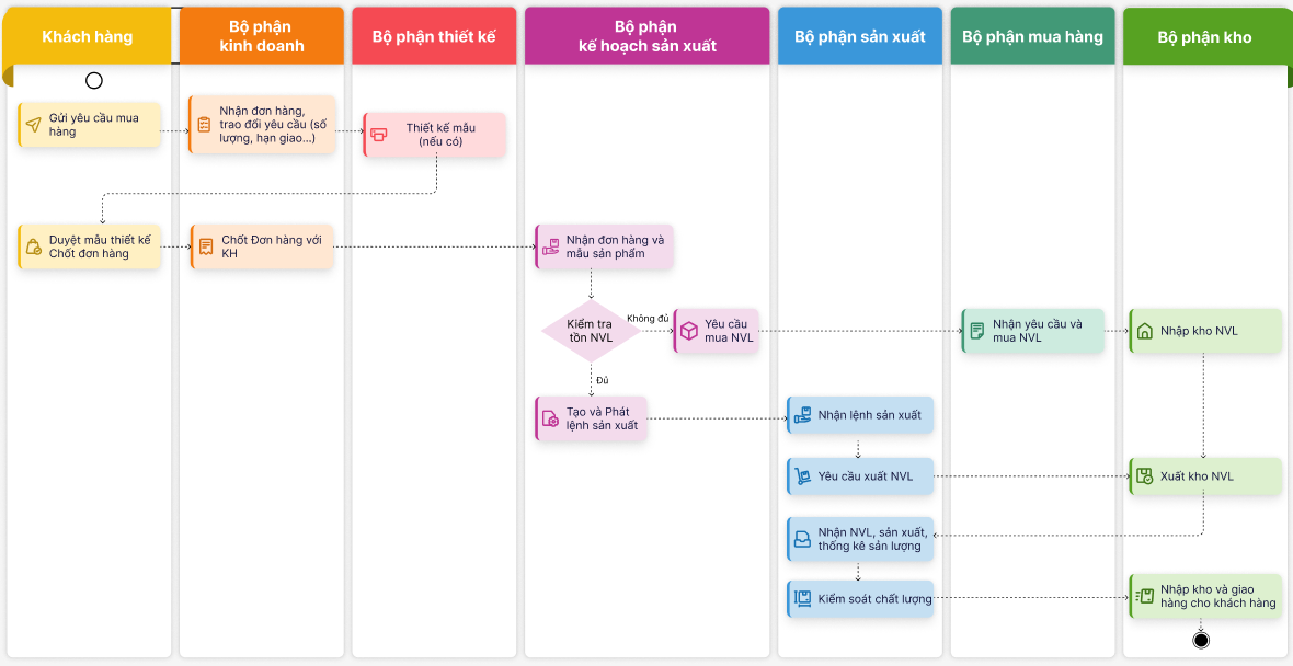 | 5. Chuẩn bị nguyên vật liệu | Gửi yêu cầu xuất kho nguyên vật liệu cho bộ phận kho hàng hoặc yêu cầu mua nguyên vật liệu để đáp ứng nhu cầu sản xuất. | Nhân viên sản xuất Mua hàng, Kho | Xem hướng dẫn >> |