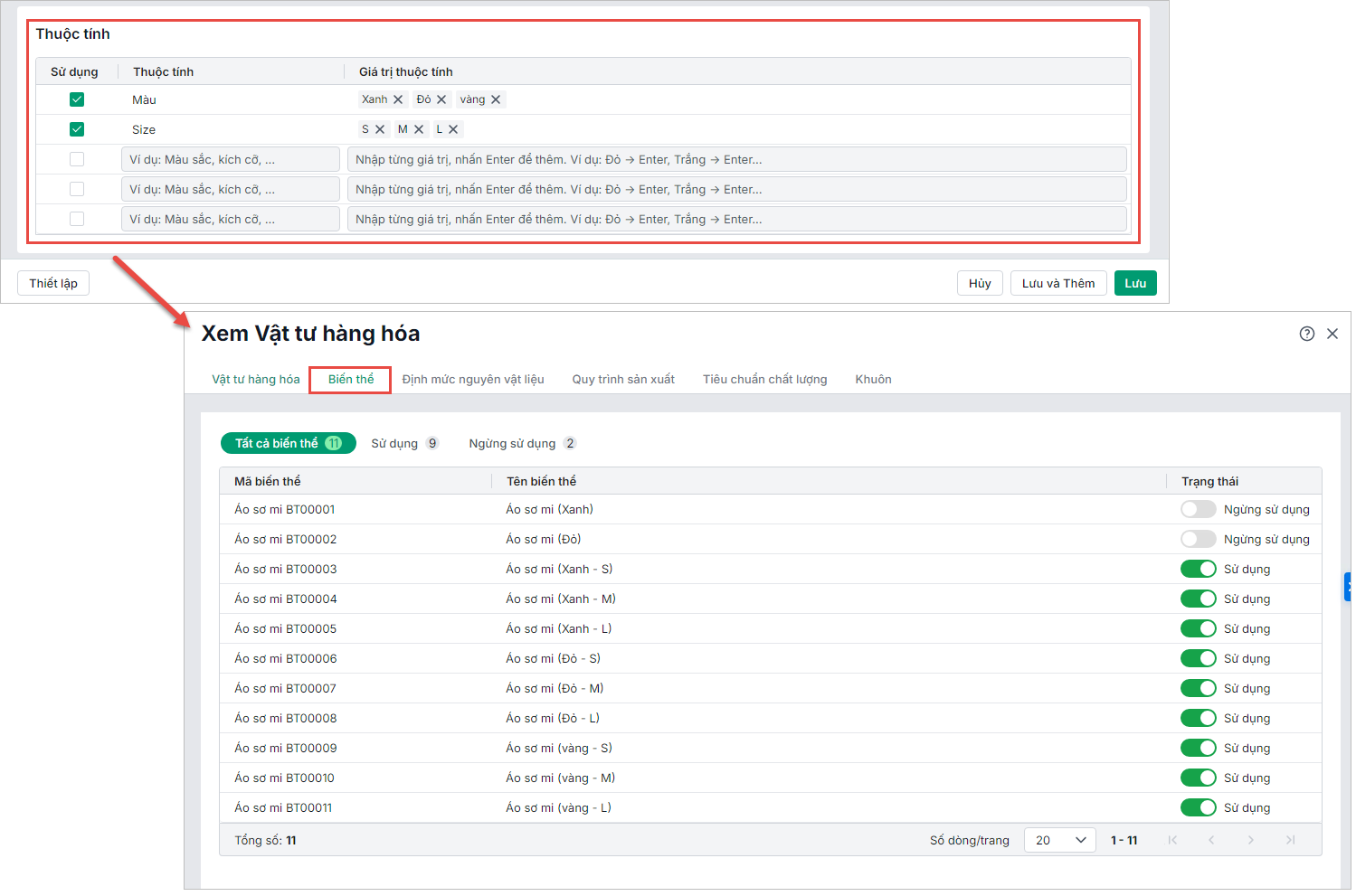 Bước 2: Khai báo thuộc tính (biến thể) cho từng VTHH