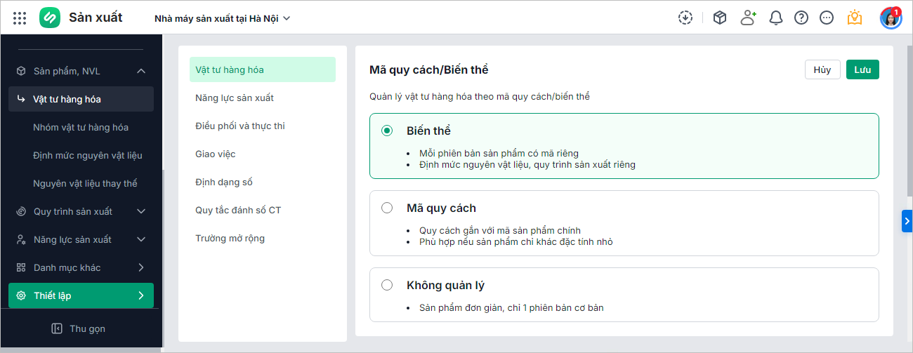 • Thiết lập cách thức quản lý vật tư hàng hóa theo biến thể