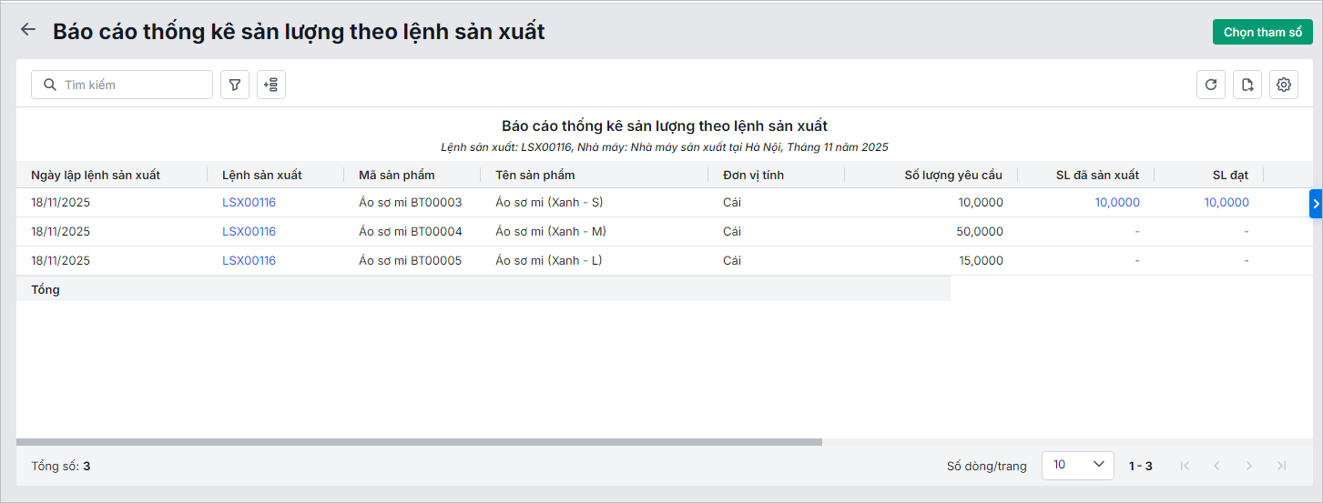 Ví dụ: Báo cáo thống kê sản lượng theo lệnh sản xuất