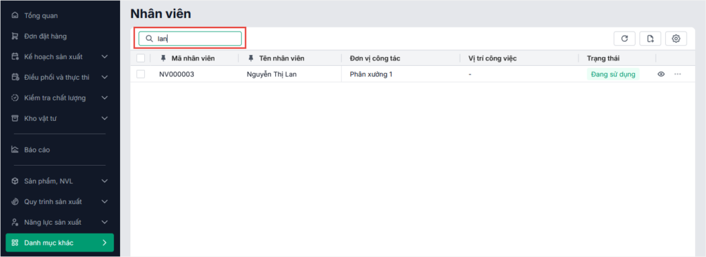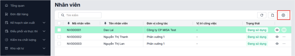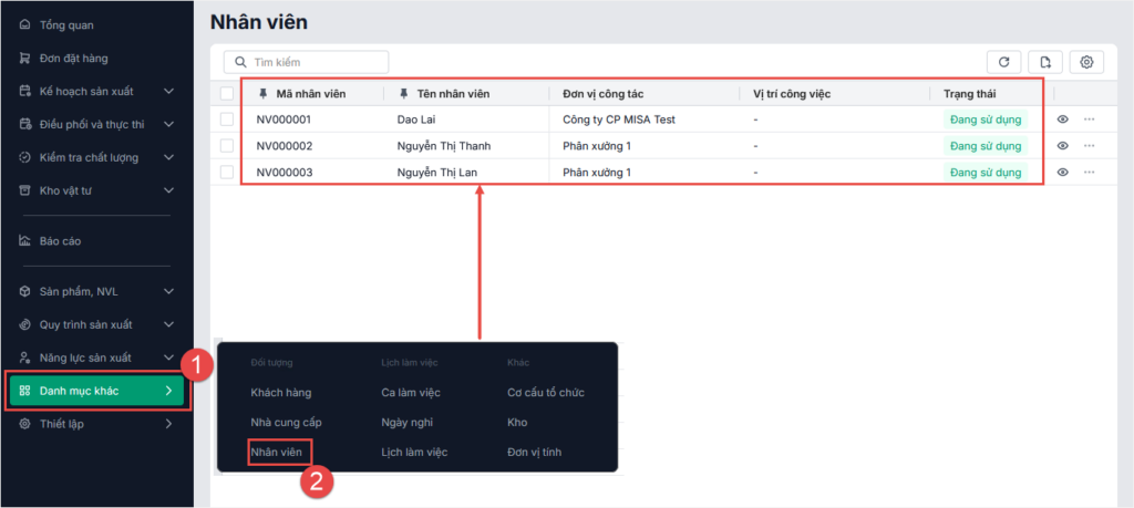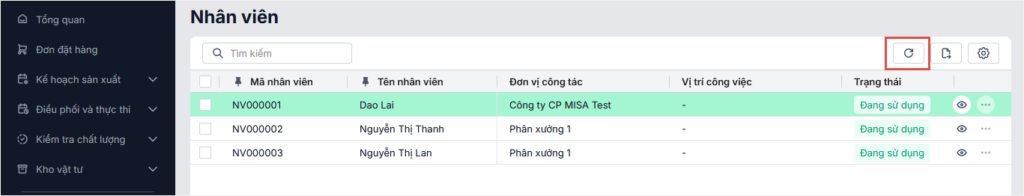 1. Danh mục nhân viên trên AMIS Sản xuất được đồng bộ từ danh mục nhân viên trên AMIS Hệ thống. Không phân biệt trạng thái nhân viên đang làm việc hay đã nghỉ việc, khi lấy về AMIS Hệ thống đều sẽ là trạng thái Đang sử dụng.