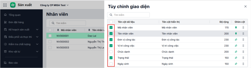 - Tích chọn các cột thông tin hiển thị trên danh mục