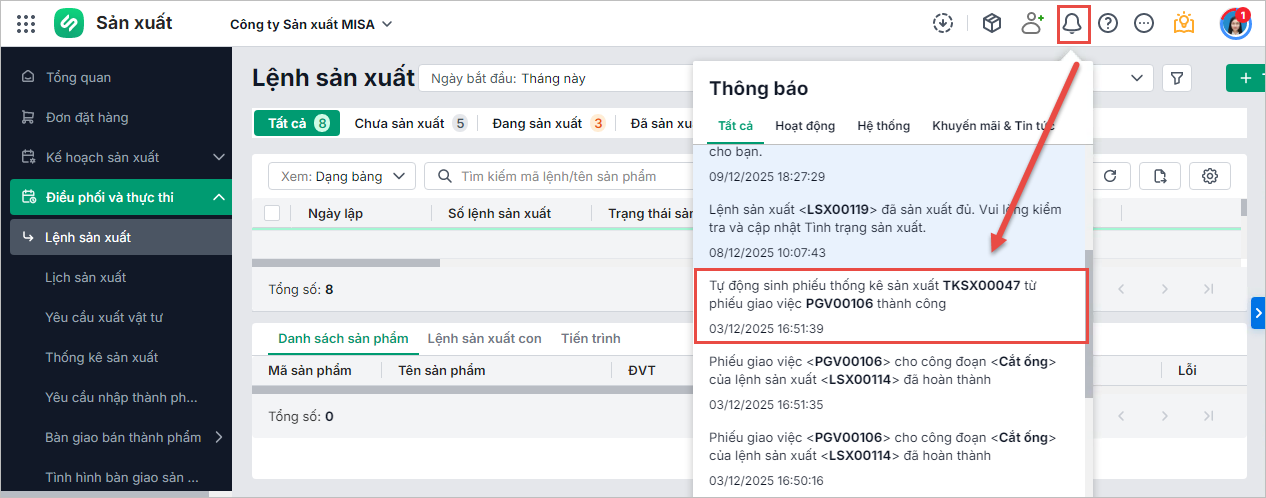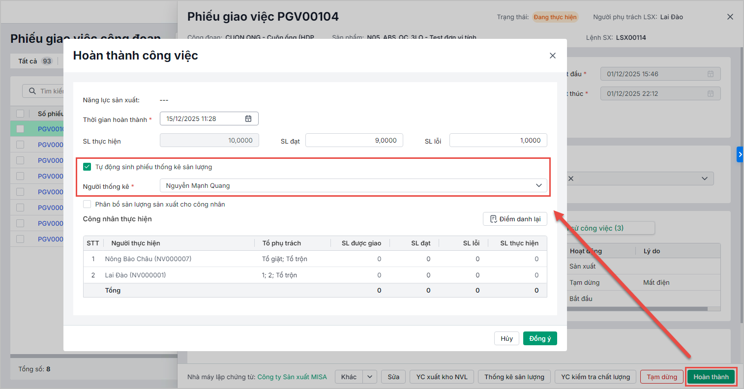 Lưu ý: Khi hoàn thành phiếu giao việc, anh chị có thể thiết lập tự động sinh phiếu thống kê sản lượng để lấy nhanh các thông tin từ phiếu giao việc lên phiếu thống kê sản xuất, giúp tiết kiệm thời gian thao tác.