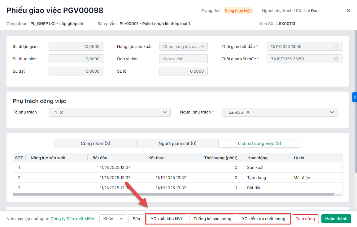 - Lập yêu cầu kiểm tra chất lượng từ phiếu giao việc có trạng thái Đang thực hiện, Hoàn thành, Tạm dừng.