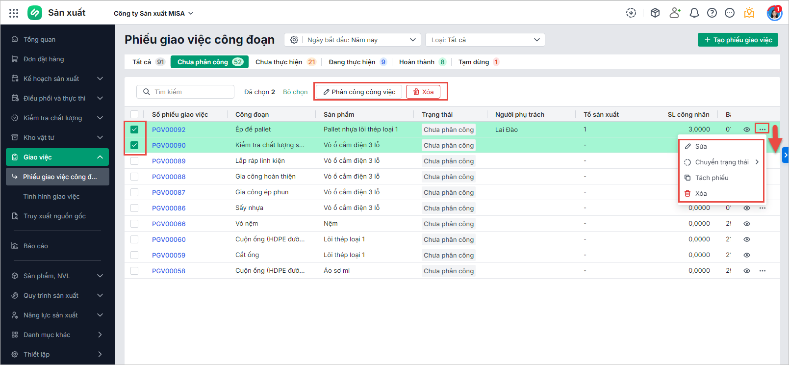 - Phân công công việc hoặc xóa hàng loạt phiếu giao việc.