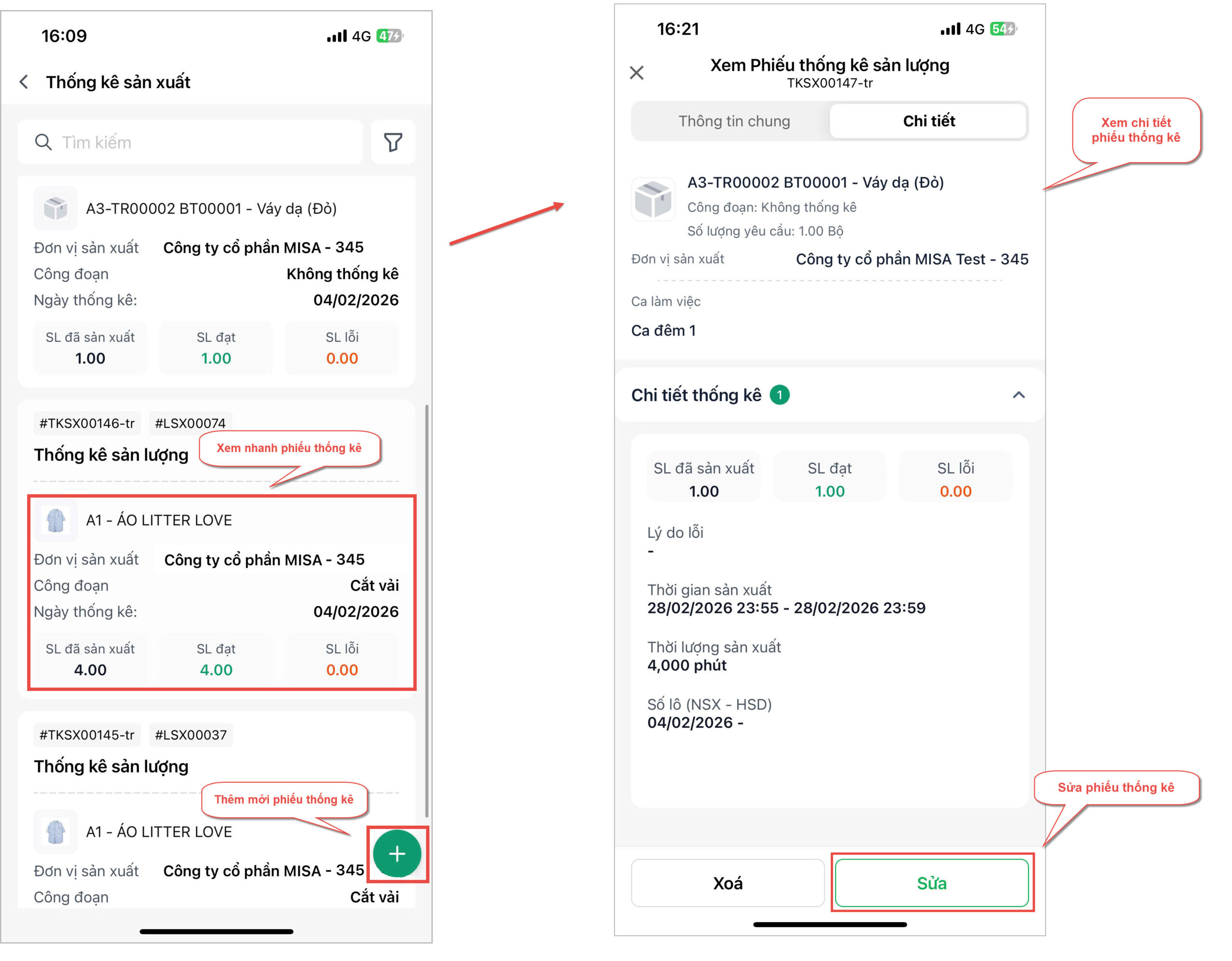 • Xem nhanh SL đã sản xuất, SL đạt, SL lỗi của từng phiếu thống kê sản lượng