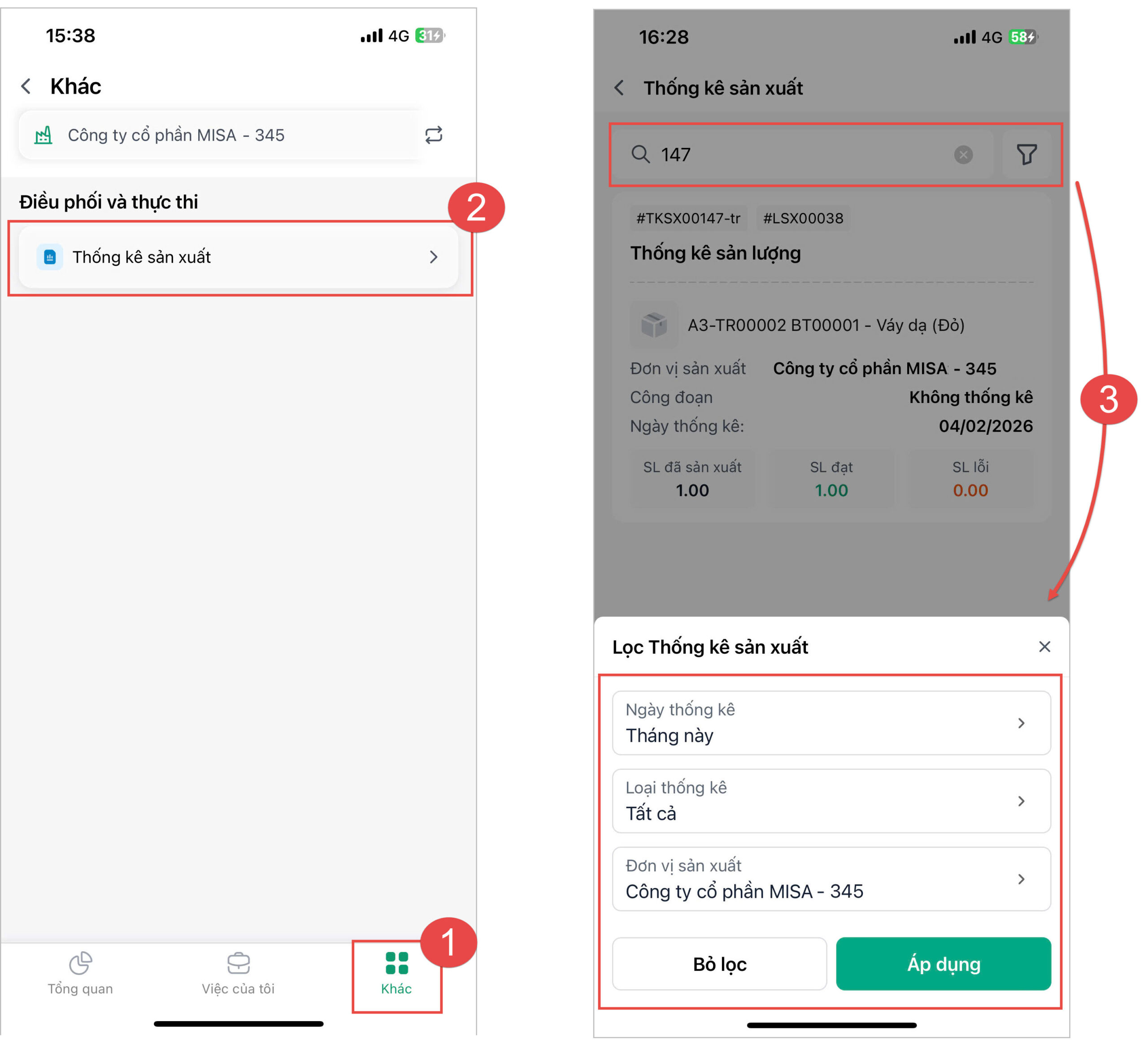 • Vào mục Khác\Điều phối và thực thi, chọn mục Thống kê sản xuất