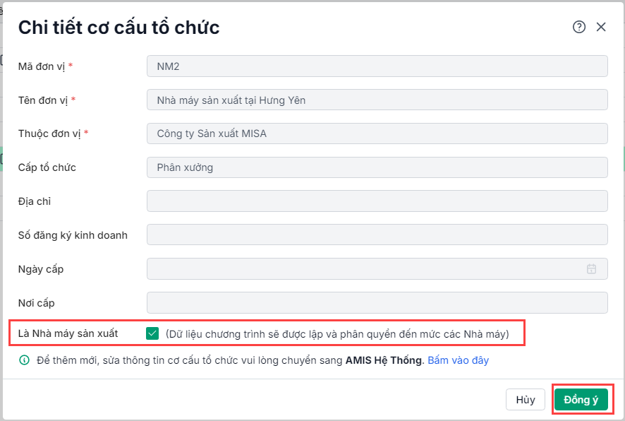 Trên cây cơ cấu tổ chức, anh/chị tìm đến đơn vị là nhà máy. Sau đó tích chọn tại cột “Là Nhà máy Sản xuất” và nhấn Đồng ý.