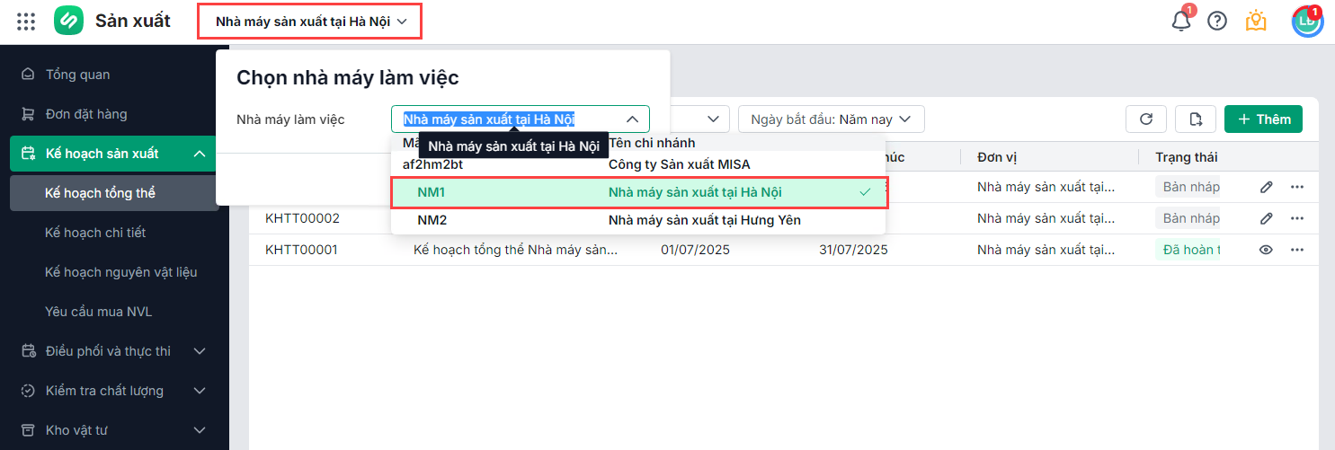 Khi làm việc, tại mục chọn dữ liệu, người dùng có thể chọn nhà máy mà mình đang làm việc để thực hiện các công việc theo đúng địa điểm.
