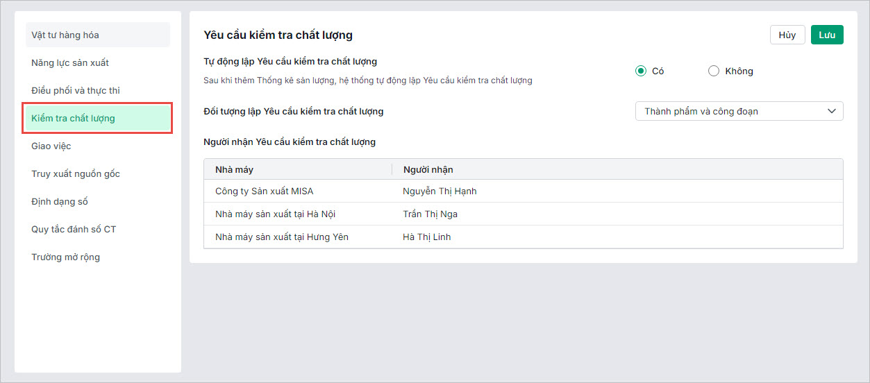 Nếu chọn , chương trình sẽ tự động lập yêu cầu kiểm tra chất lượng sau khi thêm phiếu Thống kê sản lượng tùy theo Đối tượng lập yêu cầu kiểm tra chất lượng đã thiết lập: