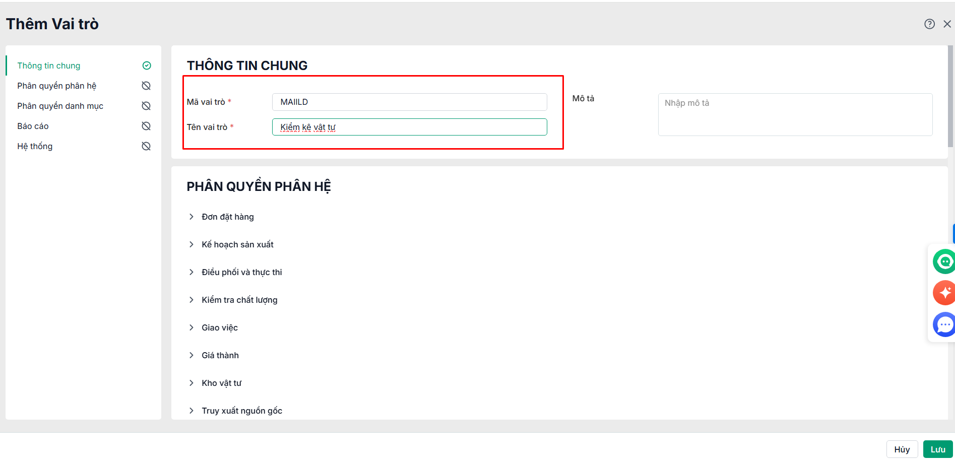 Bước 3: Khai báo các thông tin chung của vai trò: Mã vai trò, Tên vai trò, Mô tả.