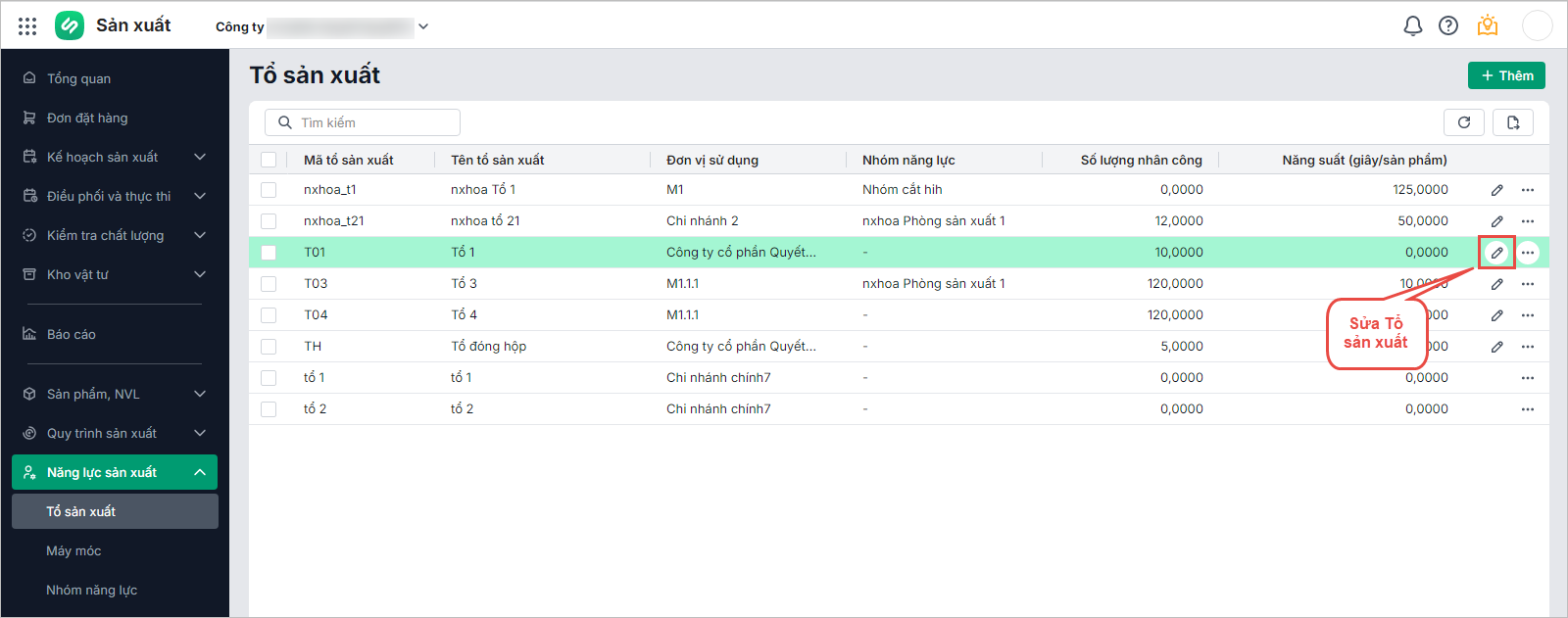 • Nhấn biểu tượng chiếc bút để chỉnh sửa thông tin Tổ sản xuất: