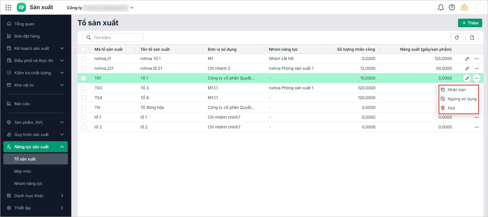 • Nhấn biểu tượng dấu ba chấm để thực hiện các chức năng: Nhân bản, Sử dụng/Ngừng sử dụng hoặc Xóa tổ sản xuất: