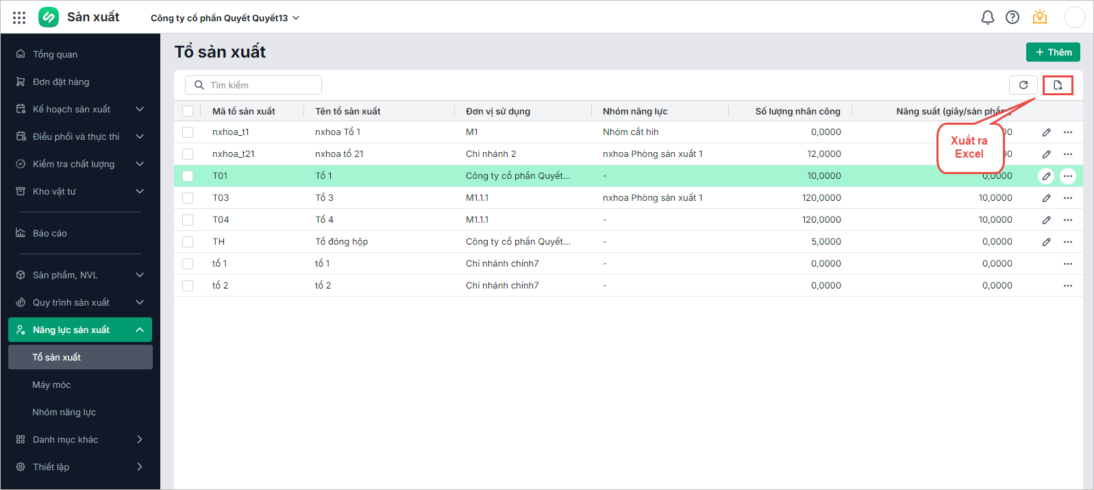 • Có thế Xuất ra Excel các tổ sản xuất phục vụ nhu cầu công việc:
