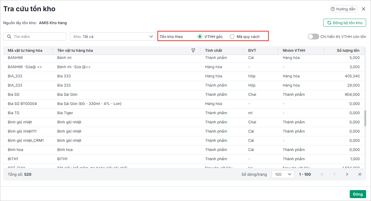 Dữ liệu tồn kho được đồng bộ từ hệ thống AMIS Kho hàng và đảm bảo chính xác theo từng thời điểm.
