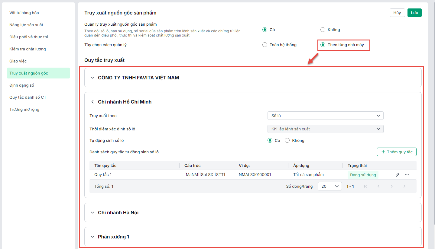 - Thao tác thiết lập quản lý truy xuất nguồn gốc theo số lô và thiết lập quy tắc đánh số lô tự động theo từng nhà máy hoặc chung trên menu Thiết lập\Tùy chọn.