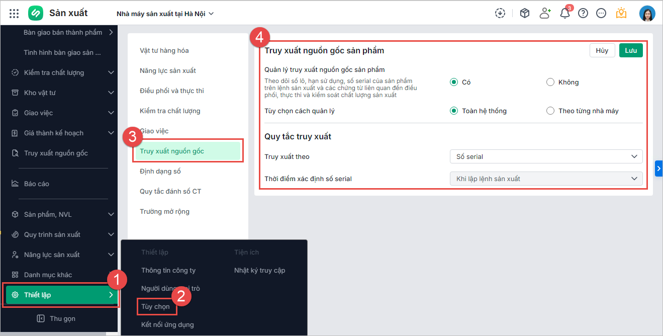 - Thao tác thiết lập quản lý truy xuất nguồn gốc theo số serial trên menu Thiết lập\Tùy chọn.