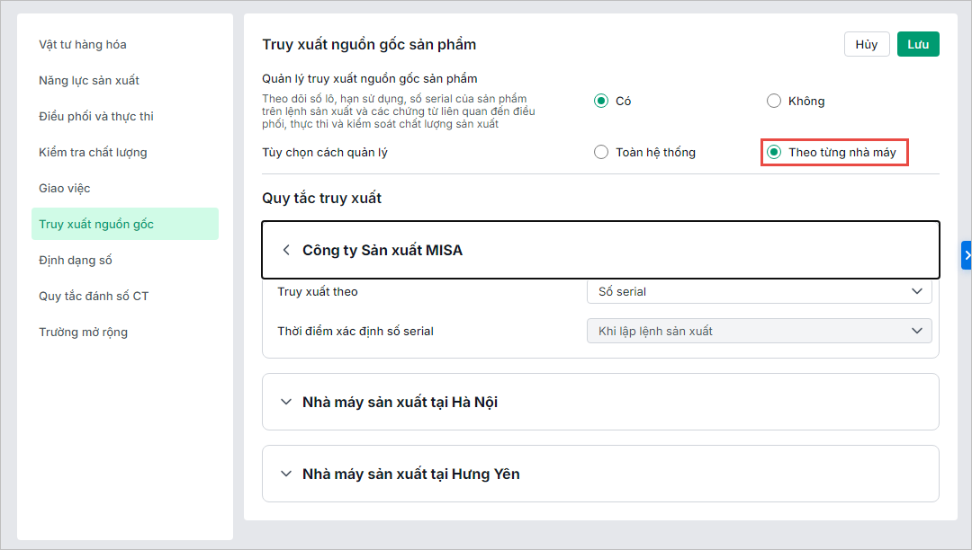 - Để thiết lập truy xuất nguồn gốc theo số serial, người dùng cần thiết lập Quản lý vật tư hàng hóa theo Mã quy cách
